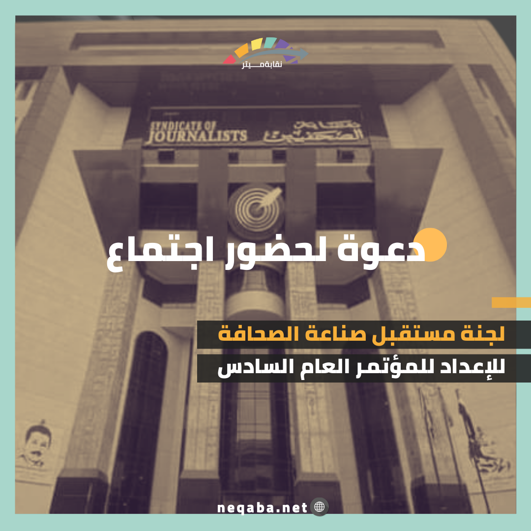 تعقد لجنة "مستقبل الصحافة"، إحدى اللجان الثلاثة للإعداد للمؤتمر العام السادس لنقابة الصحفيين، اجتماعها الأسبوعي، يوم الأربعاء، الموافق ٢٤ يوليو الجاري، في السادسة مساء بالدور الثالث في نقابة الصحفيين.