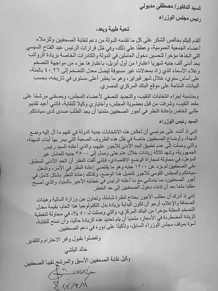وبمناسبة إجراء انتخابات النقيب، والتجديد النصفي لأعضاء مجلس النقابة، وبصفتي مرشحًا على مقعد النقيب، وشرفت من قبل بعضوية المجلس، واختياري وكيلًا للنقابة، فإنني أعيد تقديم طلبي الخاص بإعادة النظر في أجور الصحفيين متمنيا أن يجد الطلب صدى لدى سيادتكم.